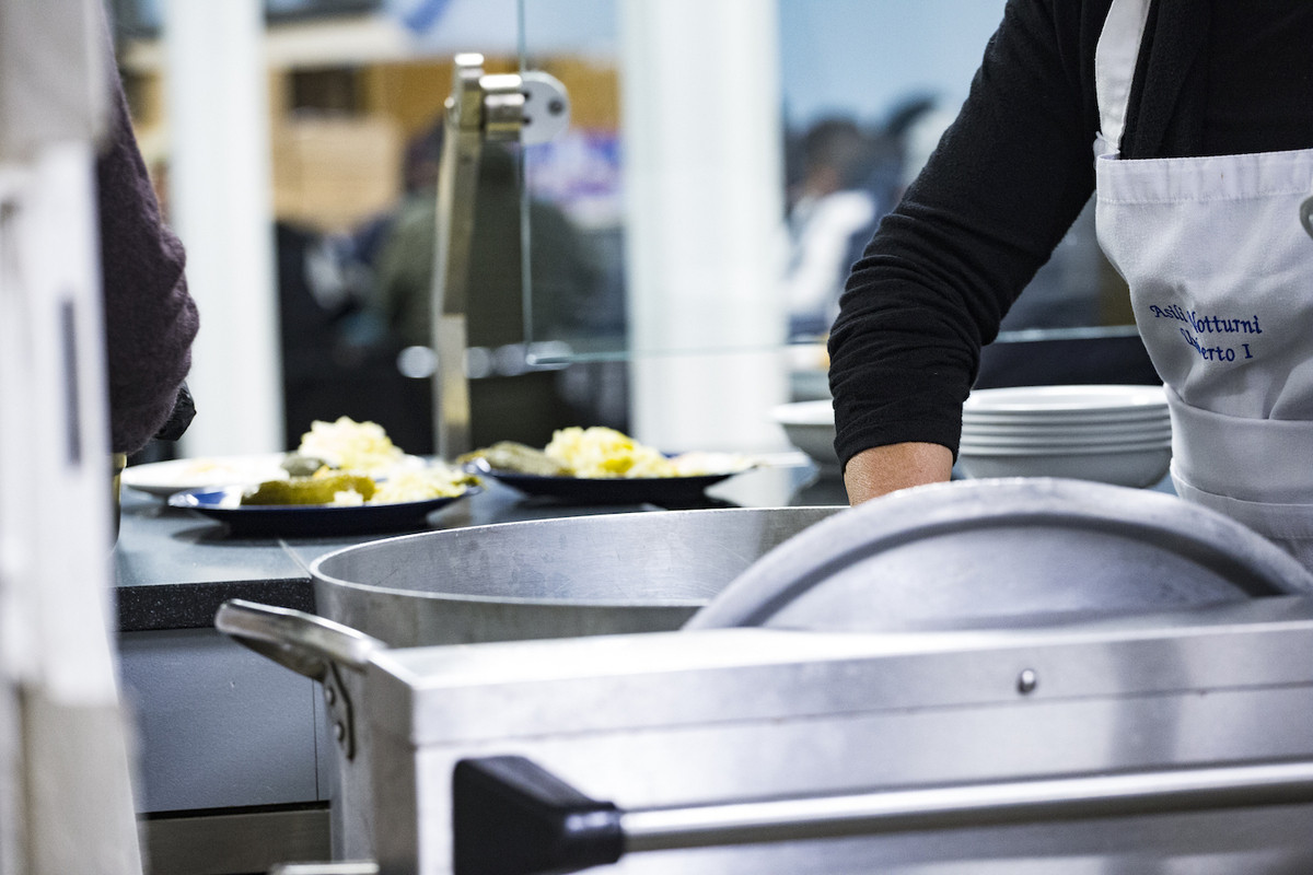Cinque chili di riso. È il quantitativo di una cena per sfamare più di un centinaio di persone. Solitamente ne si cucina almeno il doppio, ma oggi fa freddo e il riso viene aggiunto a una calda minestra di verdura. Riempie un pentolone di grandi dimensioni tanto che, per sollevarlo, sono necessari due uomini. Lo appoggiano su un carrello e dalla cucina lo trasportano nella sala mensa. E inizia la distribuzione.