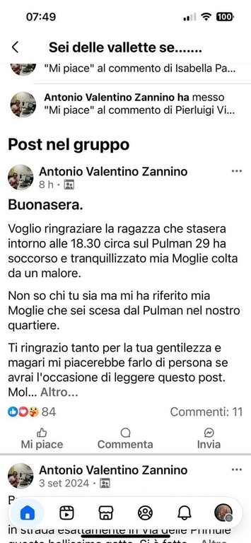 "Voglio ringraziare la ragazza che stasera intorno alle 18.30 circa sul pullman 29 ha soccorso e tranquillizzato mia moglie colta da un malore - sono le parole affidate da Zannino alle pagine social -. Non so chi tu sia ma mi ha riferito mia moglie che sei scesa dal pullman nel nostro quartiere". E conclude: "Ti ringrazio tanto per la tua gentilezza e magari mi piacerebbe farlo di persona se avrai l'occasione di leggere questo post. Molte grazie".