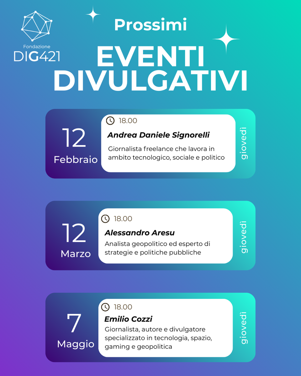 La Fondazione DIG421 annuncia il nuovo calendario di appuntamenti per il primo semestre del 2026. Una proposta come sempre ambiziosa che si snoda attraverso due percorsi paralleli: il consolidato ciclo di eventi divulgativi e lo specifico approfondimento del “ciclo AI”.