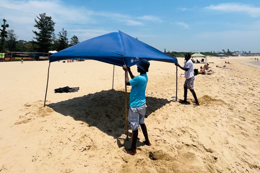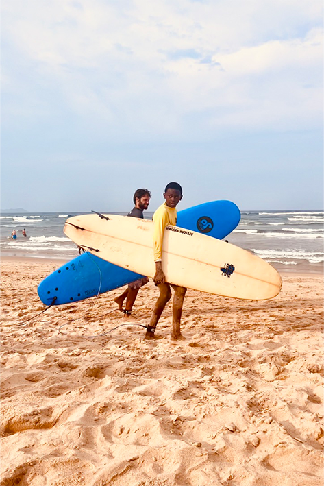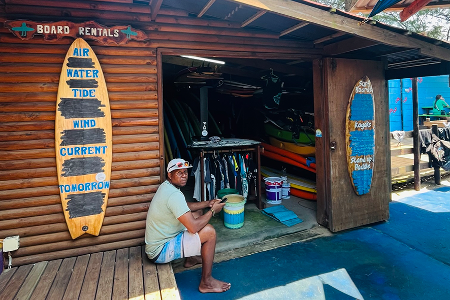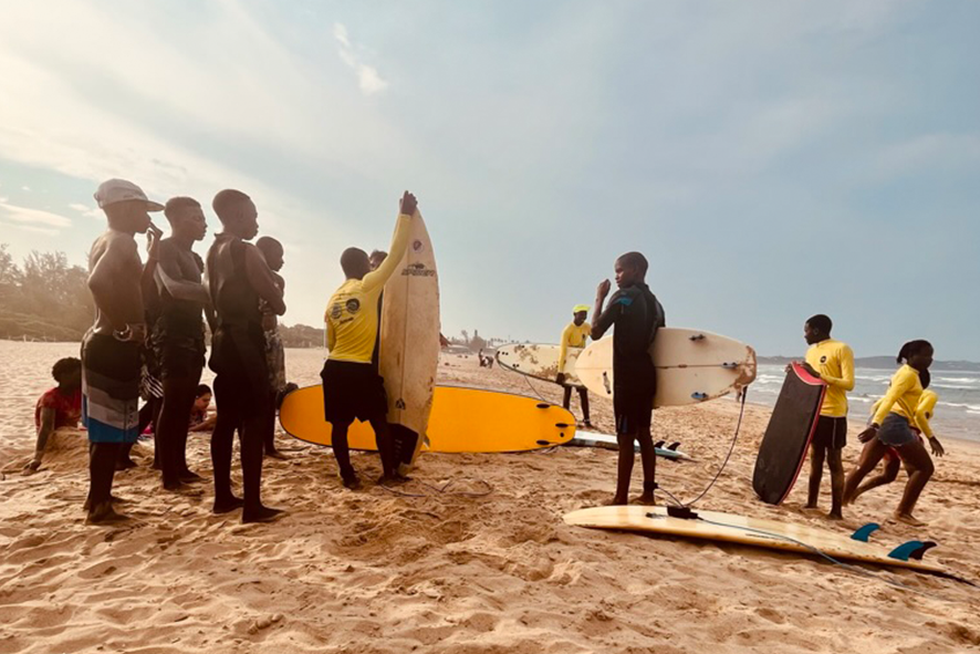 La spiaggia è a pochi metri dalla strada principale, così larga e luminosa da sembrare infinita. Le onde arrivano lunghe e si infrangono sulla riva con quella gentilezza tipica dell’Oceano Indiano. Una giovane donna prende il sole stesa su un asciugamano a righe, la pelle scura e i capelli intrecciati che scendono come corde sottili. Tiene un sandalo tra le dita, mentre la sabbia si attacca al corpo come una promessa d’estate eterna. Più in là, un gruppo di ragazzini si raduna attorno a una pila di tavole da surf. Indossano magliette gialle, alcuni già bagnati, altri con l’aria di chi sta per entrare in acqua. Parlano fitto, ridono, si spingono tra loro. Il surf qui non è moda, è vita. È futuro. Le scuole non insegnano solo a cavalcare le onde, ma a coltivare una disciplina, un sogno, un mestiere. Un uomo siede davanti a una piccola bottega di legno con tavole colorate appese alle pareti: Board Rentals. Si potrebbe pensare che noleggi solo tavole. In realtà, affitta possibilità.