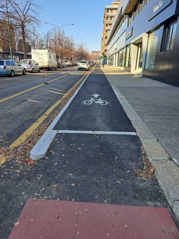 La soluzione adottata prevede una pista ciclabile in carreggiata, affiancata al marciapiede, con la traslazione dei parcheggi e l’inserimento di uno spazio di sicurezza tra le auto in sosta e la corsia ciclabile. Una configurazione diversa rispetto a quella di corso Cosenza, dove la pista corre più vicino alla carreggiata e alle auto in movimento. Il cambio di impostazione è particolarmente evidente all’altezza di corso Unione Sovietica, uno dei nodi più trafficati della zona.