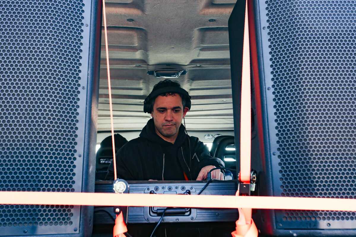 Sul furgone che apre il corteo di Porta Susa alla consolle l'artista eporediese Cosmo.