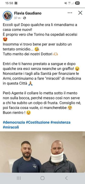 "Entri - prosegue - che ti hanno pestato a sangue e dopo qualche ora esci senza un graffio. Nonostante i tagli alla Sanità per finanziare le Armi, continuiamo a fare "miracoli" di medicina in questa città. Però agente il collare lo metta sotto il mento, non sulla bocca perché messo così non serve a chi ha subìto in colpito di frusta".