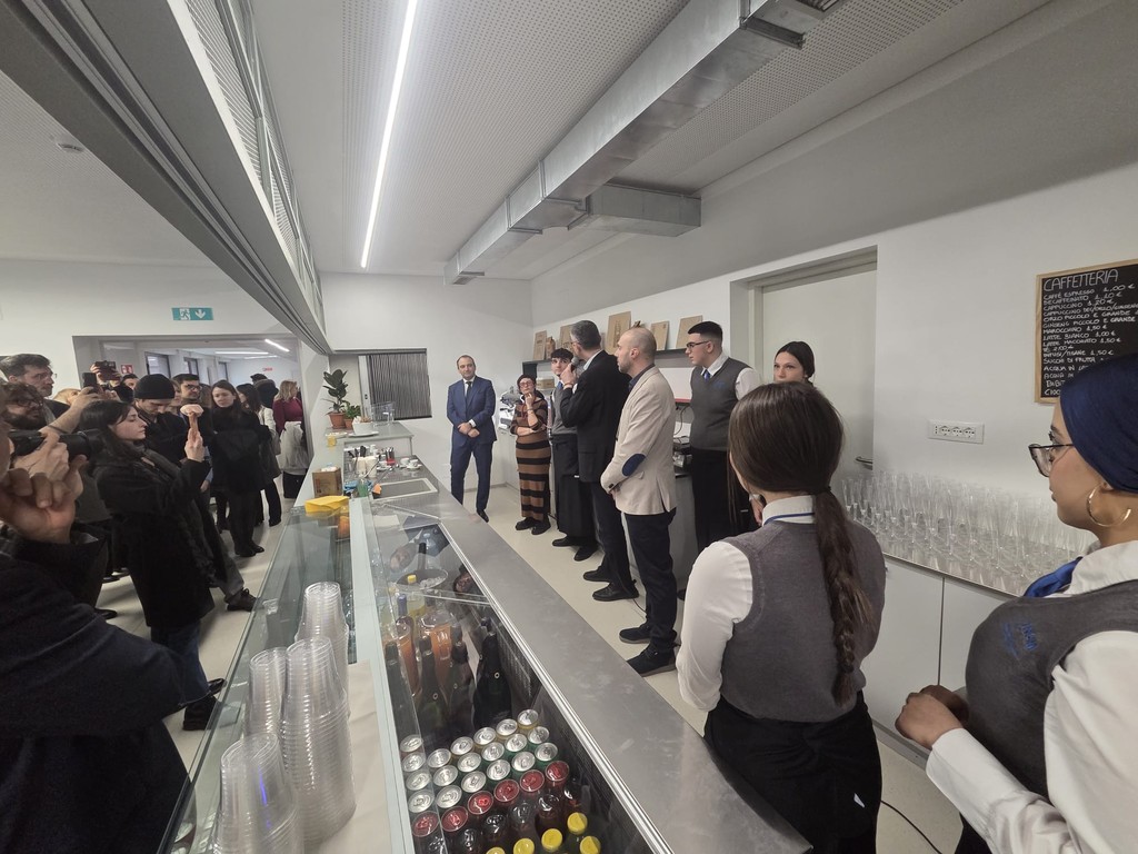 Il pomeriggio si è concluso con il taglio del nastro e la presentazione operativa del bar a cura di Marco Muzzarelli, direttore nazionale ENGIM, affiancato dagli allievi che inizieranno ufficialmente l’attività di gestione della struttura.
