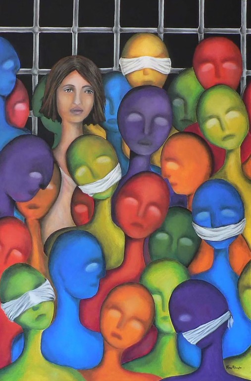 ps Commento dell’artista Flora Palumbo sull’opera pittorica: “In un contesto in cui le persone non vogliono ascoltare -sorde- e non vogliono vedere -cieche, in un mondo indifferente, chiuso, insensibile, esiste comunque qualcuno che resta vivo… un’ottica forse amara ma sicuramente speranzosa. Perché riconosce che, nonostante tutto, c’è sempre chi non si lascia spegnere”