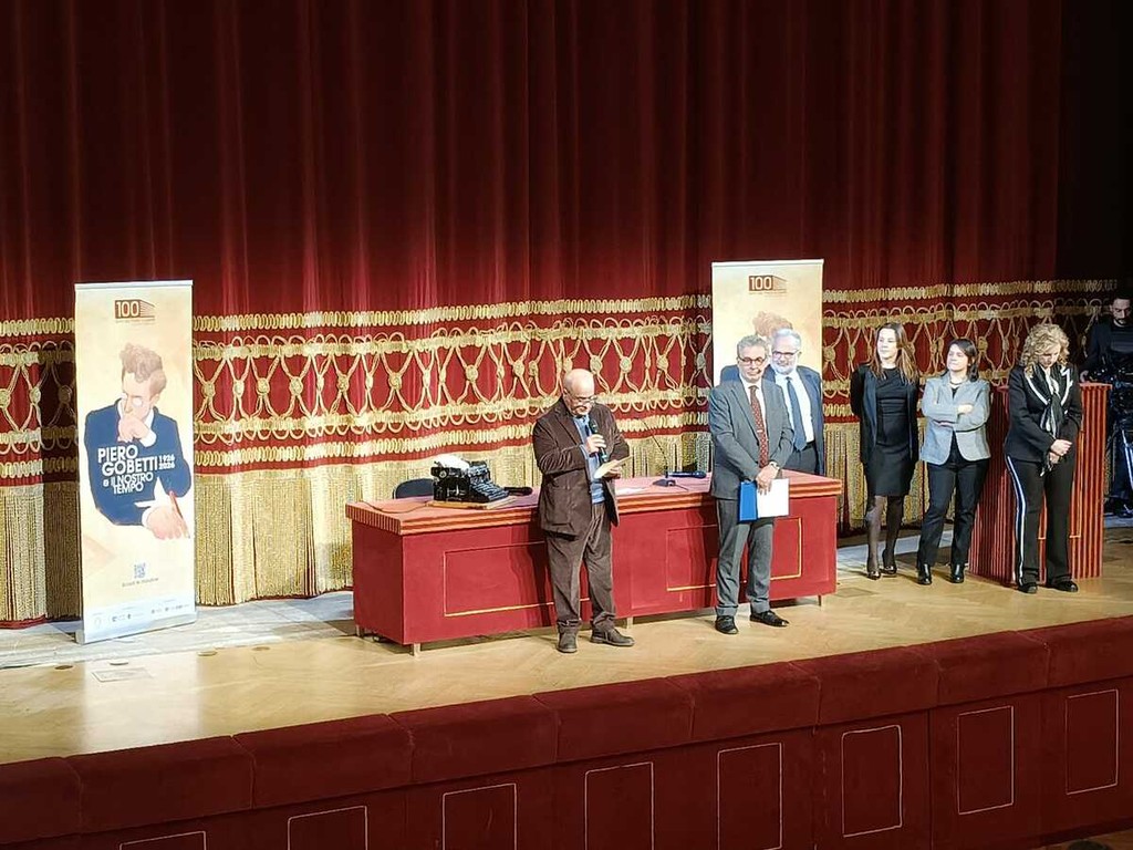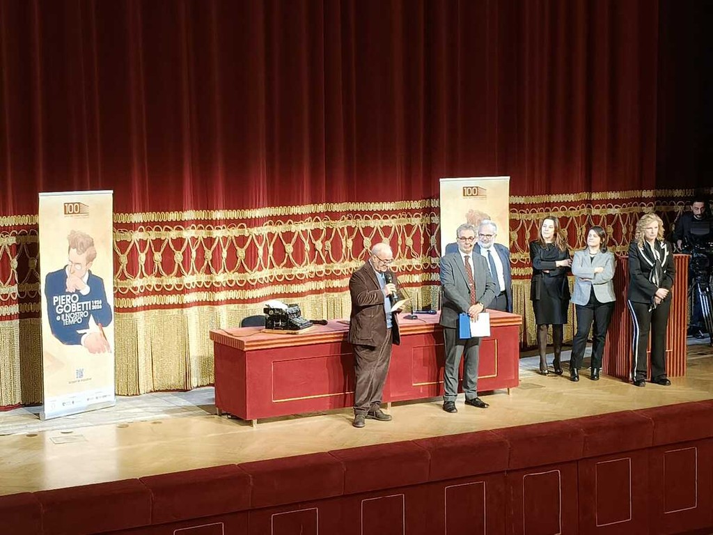 Polito Piero, presidente centro studi Piero Gobetti, ha ricordato la figura dell' intellettuale antifascista che fondò numerose riviste. Sul palco anche il nipote Andrea. "Quello di Gobetti - ha osservato Polito - è un progetto di cerchio che non si chiude, nuove concezioni di modernità e libertà".