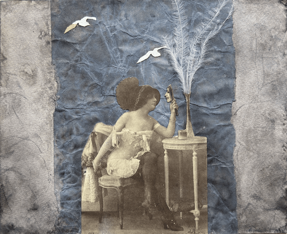 I corpi femminili che popolano i collage di India Evans provengono da ritagli di vecchie fotografie e libri d’arte. L’artista racconta che tutto ebbe inizio a Roma, al mercato di Porta Portese, con il ritrovamento di una scatola da scarpe colma di fotografie in bianco e nero di nudi ottocenteschi — immagini che, nelle sue parole, “sembravano chiedere di essere riportate alla visibilità”. Da allora, anche dopo il rientro a New York, la ricerca di immagini diventa per Evans una pratica costante: archivi, librerie, mercati come luoghi in cui intercettare figure "in attesa di essere reinserite nel presente”.