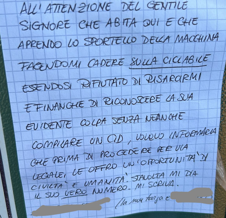 A scrivere, infatti, è una persona che si rivolge a un uomo che dovrebbe abitare proprio al civico 23. E che "aprendo lo sportello della macchina facendomi cadere sulla ciclabile, essendosi rifiutato di risarcirmi e finanche di riconoscere la sua evidente colpa senza neanche compilare un cid", dice "volevo informarla che prima di procedere per via legale, le offro un'opportunità di civiltà e umanità. Stavolta mi dia il suo vero numero. Mi scriva". E lascia i propri recapiti telefonici e la targa.