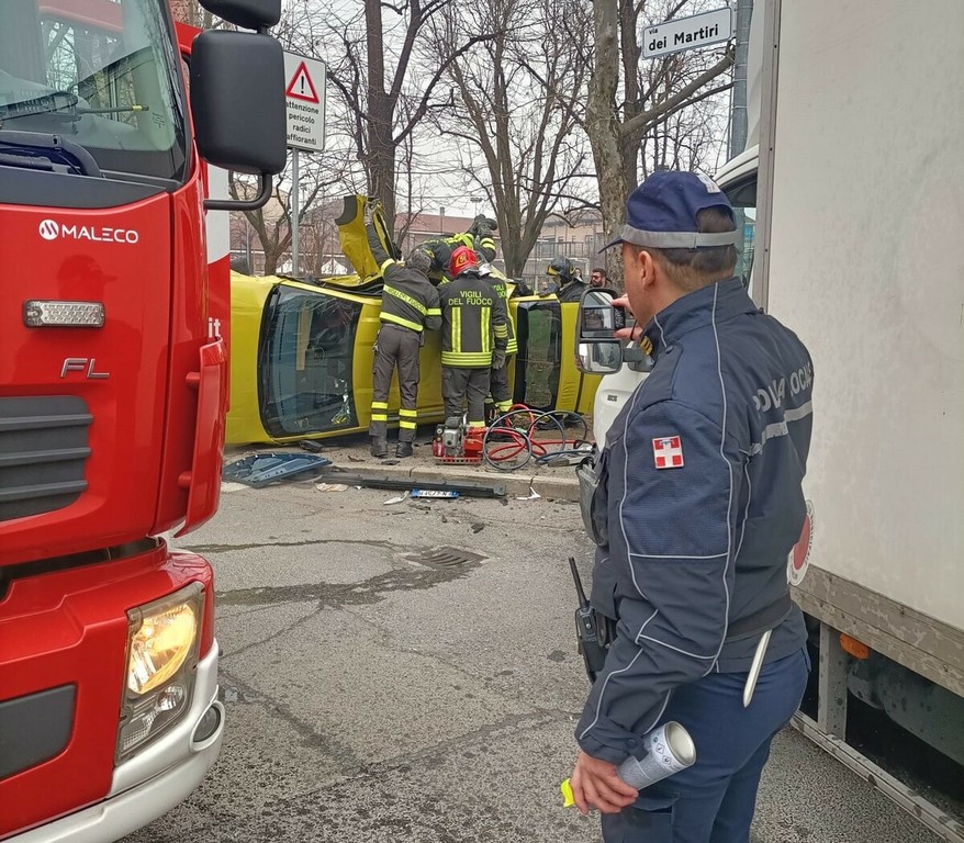 L'autocarro colpiva con la parte frontale la fiancata laterale destra della Panda facendola ribaltare. E' stato necessario intervento dei Vigili del fuoco per estrarre la donna alla guida della Fiat Panda dalle lamiere, che è stata trasportata al Cto di Torino in codice giallo.