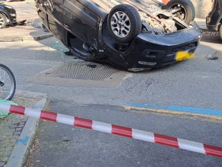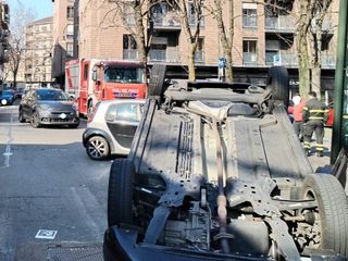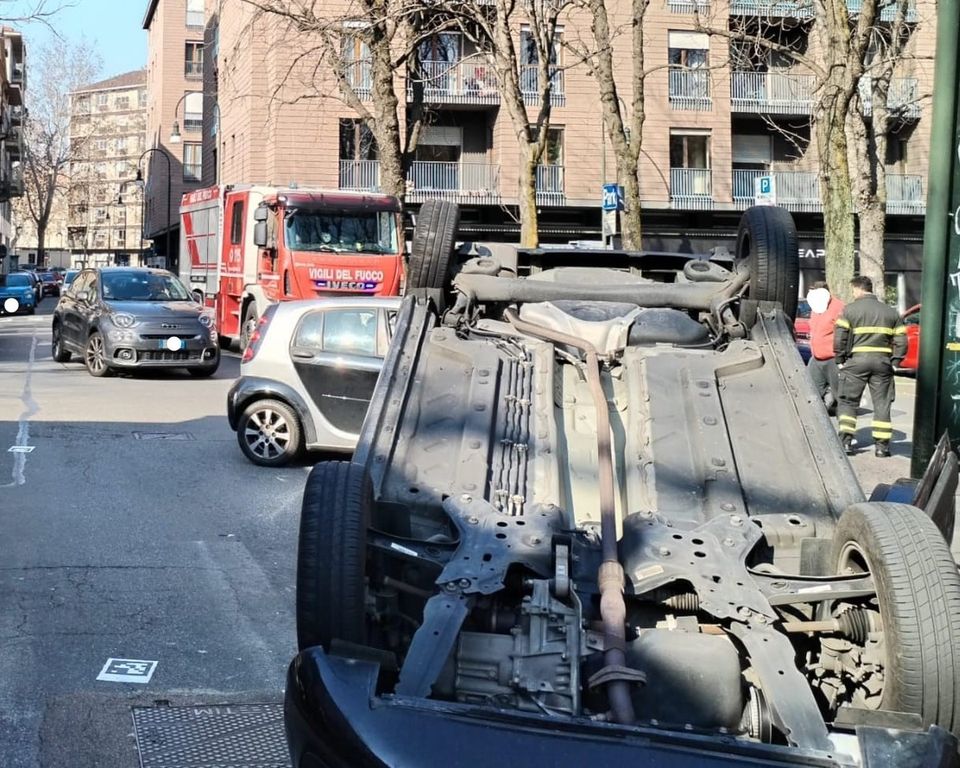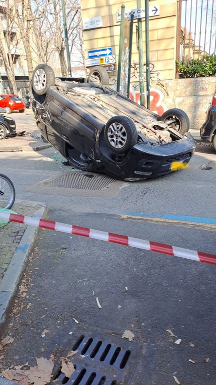 Auto ribaltata in via Carlo Ignazio Giulio all'angolo con corso Valdocco a Torino. Intorno alle 11.30 si è verificato un incidente nel quartiere Valdocco. Il conducente della vettura che dall'arteria principale stava svoltando nella strada laterale avrebbe perso il controllo del mezzo, che ha così carambolato.