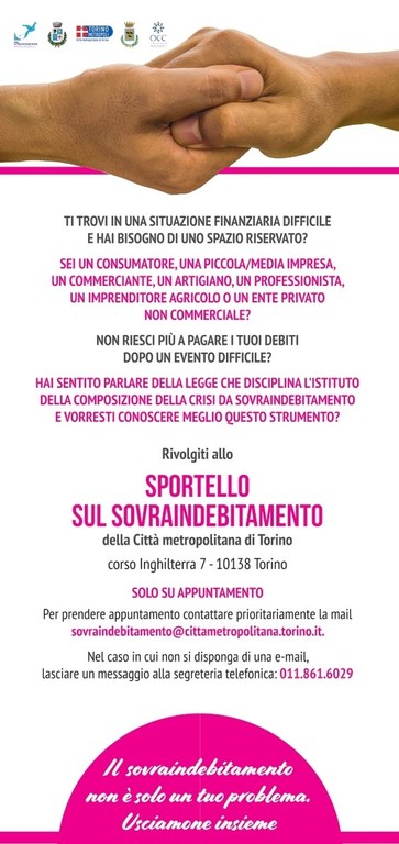 Per ulteriori info: https://www.cittametropolitana.torino.it/istruzione-e-sviluppo-sociale/sviluppo-sociale/sportello-sovraindebitamento