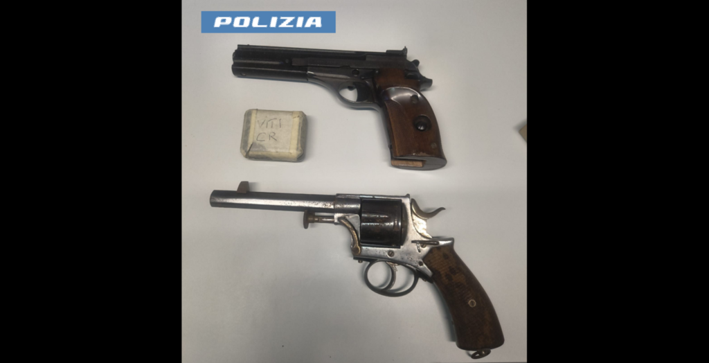 Sempre nell’ambito della stessa attività, gli agenti del Commissariato procedono alla perquisizione dell’abitazione di un altro ventiquattrenne. Qui rinvengono, dietro una parete in cartongesso, una pistola calibro 22 risultata rubata nel 2023 e un revolver dei primi anni del secolo scorso, quest’ultimo nascosto sotto il sellino di uno scooter. Nel cestello della lavatrice, invece, i poliziotti trovano una scatola contenente 5 proiettili calibro 22. Per il ventiquattrenne, oltre all’arresto per il possesso delle armi scatta anche la denuncia per ricettazione per la provenienza furtiva di una delle due pistole e per il possesso delle munizioni.