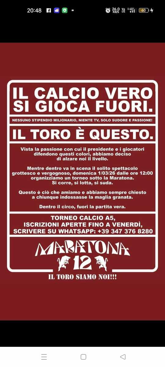 Intanto per domenica è annunciata nuovamente la curva Maratona vuota, in occasione della delicata sfida contro la Lazio: un film già visto contro il Lecce ed il Bologna, una forma di contestazione che potrebbe durare anche fino al termine del campionato. E all'esterno dello stadio, a partire da mezzogiorno, i gruppi organizzati del tifo hanno deciso di organizzare un torneo di calcio a 5 per prendere le distanze anche dalla squadra. Un ulteriore segnale di disaffezione verso quel che resta del Toro.