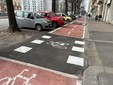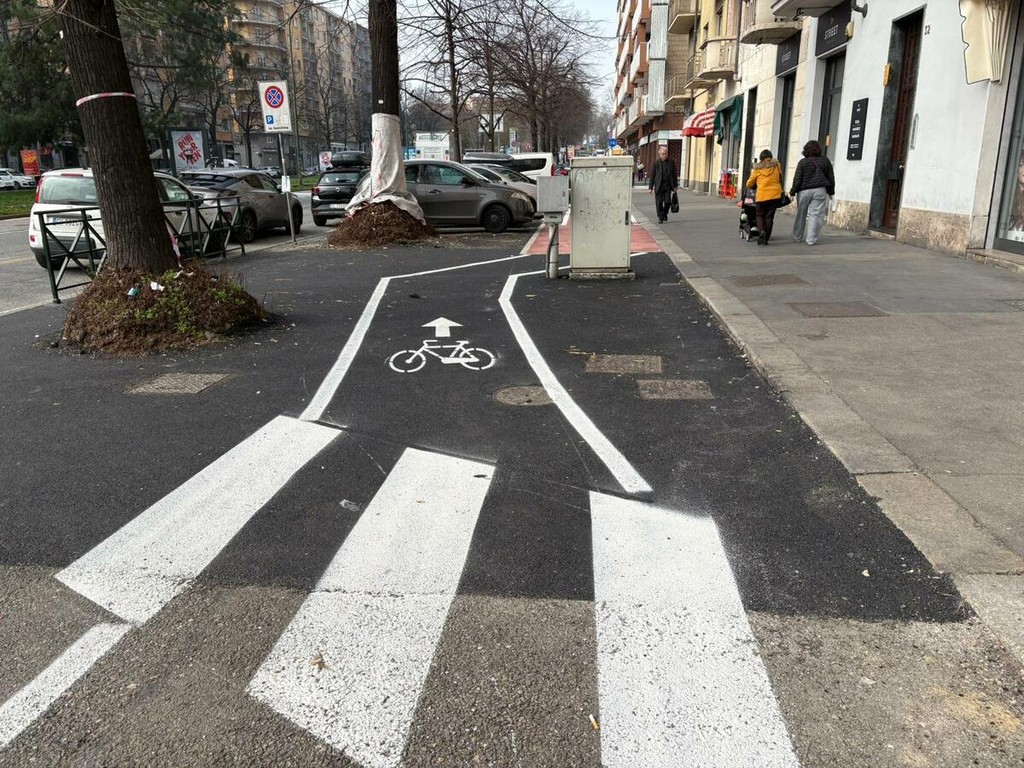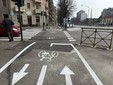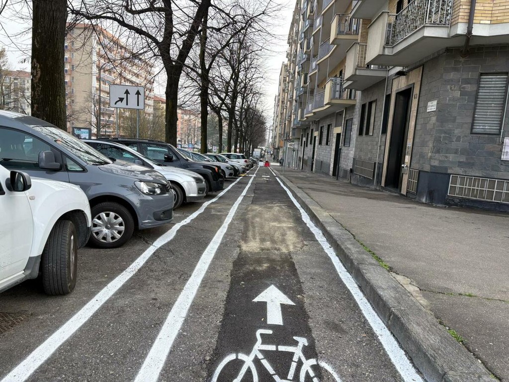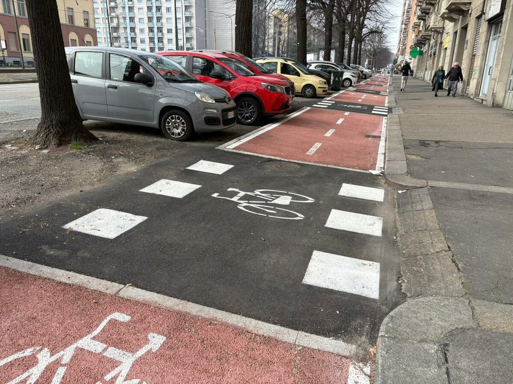 Dopo l’intersezione con via Nizza, però, la pista cambia configurazione e diventa monodirezionale. La scelta è stata dettata principalmente dalla presenza di un marciapiede più stretto, che non avrebbe consentito di mantenere il doppio senso di marcia in sicurezza.