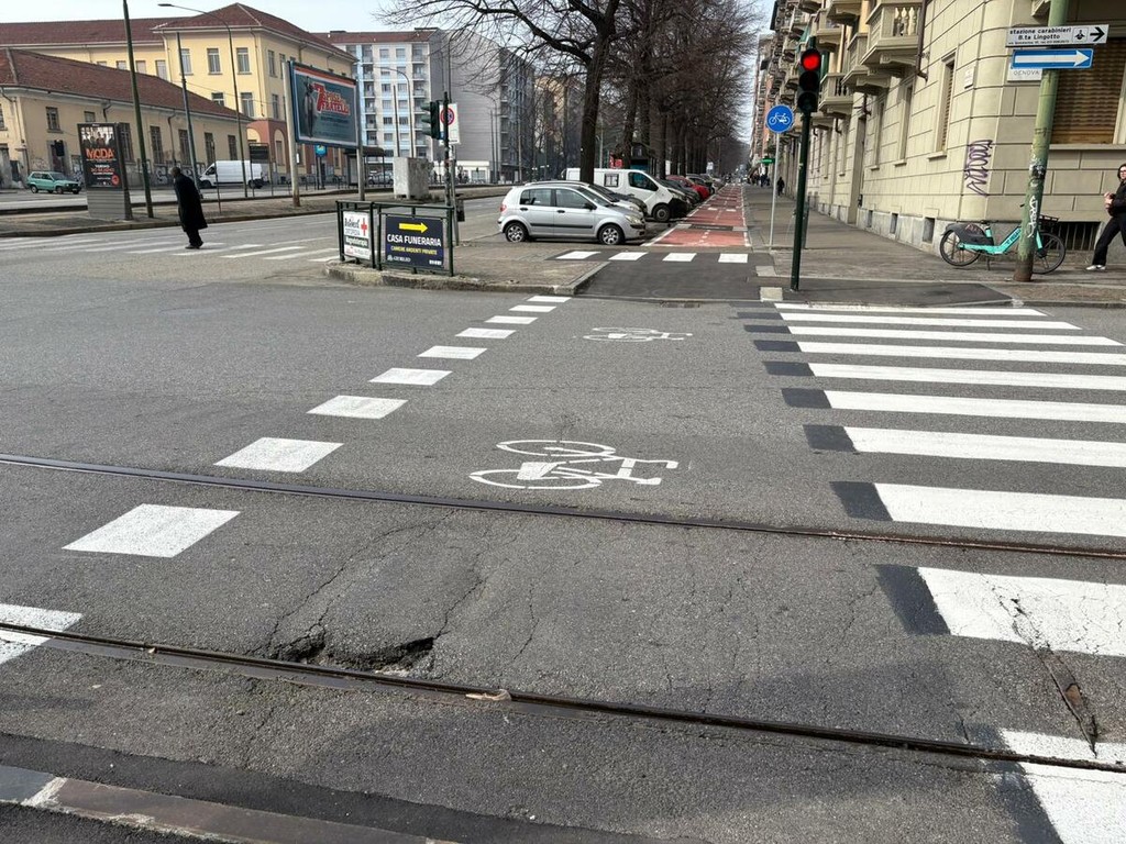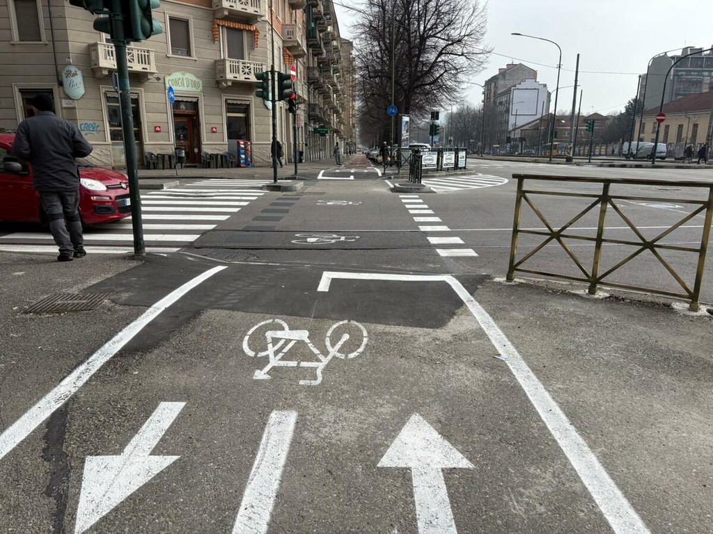 La pista si collega direttamente anche con quella di via Nizza. All’angolo tra le due strade è stata infatti disegnata a terra un’isola di traffico che organizza meglio i flussi e permette il raccordo tra i due percorsi ciclabili. Da qui parte anche un altro tratto bidirezionale che passa vicino alla scuola Re Umberto e prosegue in direzione corso Roma, verso Moncalieri.