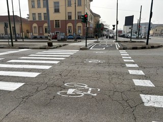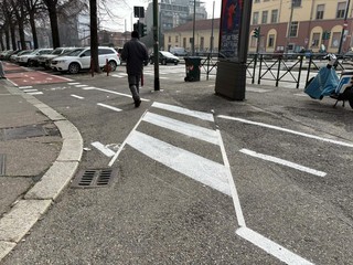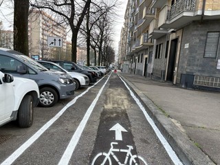 Dopo l’intersezione con via Nizza, però, la pista cambia configurazione e diventa monodirezionale. La scelta è stata dettata principalmente dalla presenza di un marciapiede più stretto, che non avrebbe consentito di mantenere il doppio senso di marcia in sicurezza.