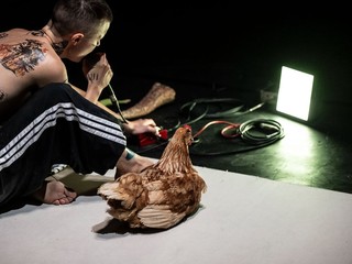 Accanto alla performer compare anche una gallina meccanica, compagna di viaggio ironica e antieroica: simbolo biologicamente capace di piangere ma incapace di farlo, metafora delle donne di questo poema che resistono senza poter concedersi lacrime.