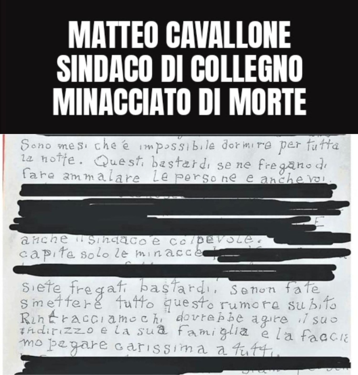 "Ma incitare alla violenza, augurare il male a me, mia moglie e le mie figlie, questo no", conclude Cavallone. Ad esprimere "piena solidarietà al sindaco" Collegno Rinasce ed il consigliere regionale del PD Daniele Valle, che chiarisce: "Le minacce non fermeranno chi ogni giorno lavora per la propria comunità. Colpire un sindaco vuole dire colpire il cuore stesso della comunità"