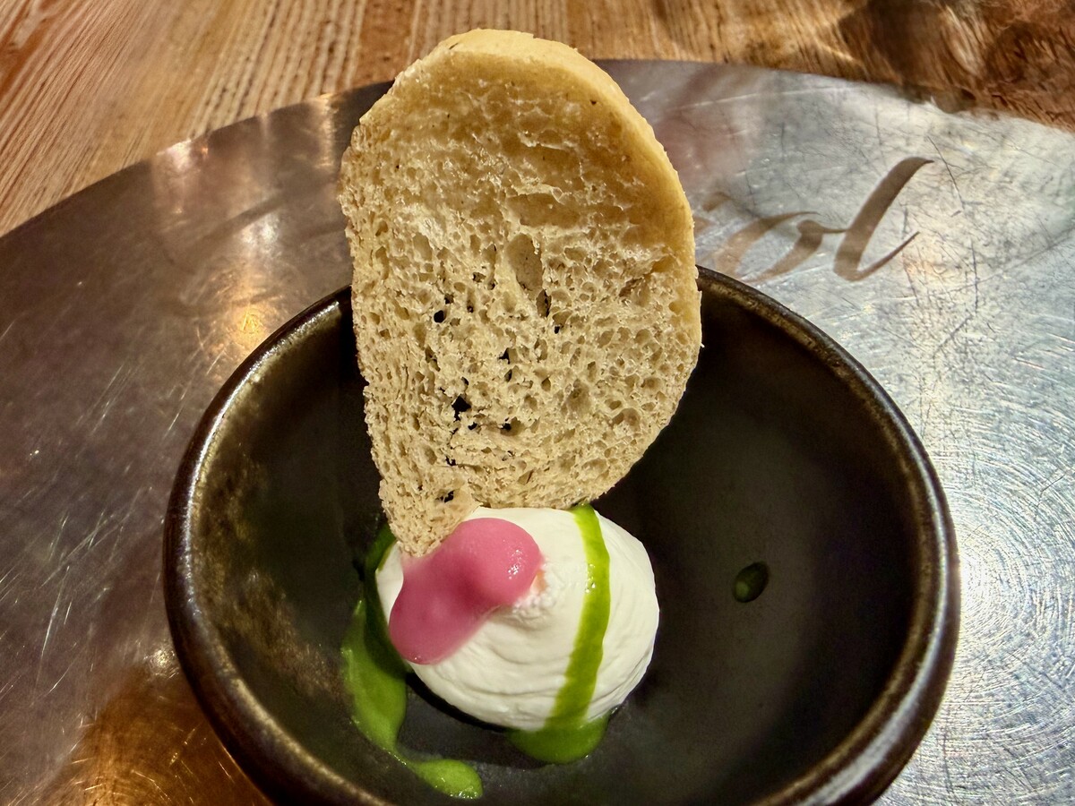 Devo confessare francamente che la lettura del menu qualche perplessità me l’ha suscitata: gli ingredienti nei piatti mi sembrava davvero troppi per poter essere gestiti brillantemente. Ma di lì a poco i miei dubbi si sarebbero dissolti senza se e senza ma. Non tanto per l’appetizer, un essenziale Crema di tomino, gel di cipolla rossa, salsa verde, crostino di pane,