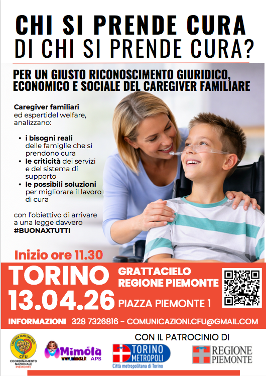 Chi si prende cura di chi si prende cura? È una domanda semplice, ma ancora senza una risposta pienamente strutturata nel sistema di welfare. Da qui prende il via l’iniziativa promossa da Mimola APS, che organizza a Torino la conferenza stampa del Coordinamento Nazionale Caregiver Familiari Uniti (CFU), in programma lunedì 13 aprile 2026 alle ore 11.30 presso il Grattacielo della Regione Piemonte, in piazza Piemonte 1.