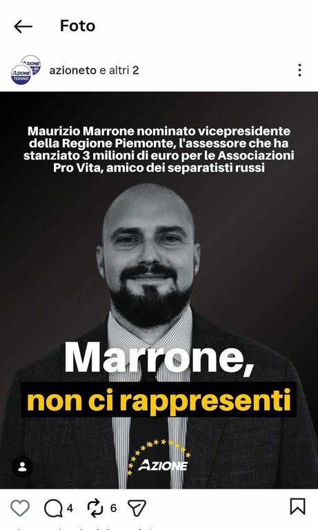 A questo si aggiunge, sullo stesso tono, il post dei giovani di Azione con scritto: "Maurizio Marrone nominato vicepresidente della Regione, l'assessore che ha stanziato 3 milioni di euro per le associazioni pro Vita, amico dei separatisti russi. Marrone non ci rappresenti".