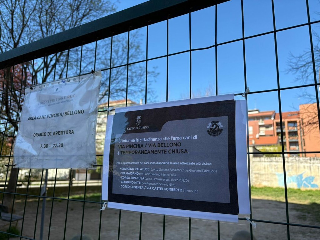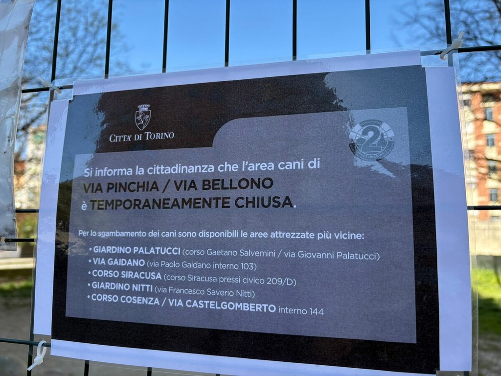 Il cartello, inoltre, ricorda le altre aree di sgambamento vicine: giardino Palatucci, corso Cosenza angolo via Castelgomberto, giardino Nitti, via Gaidano interno 103 e corso Siracusa 209.