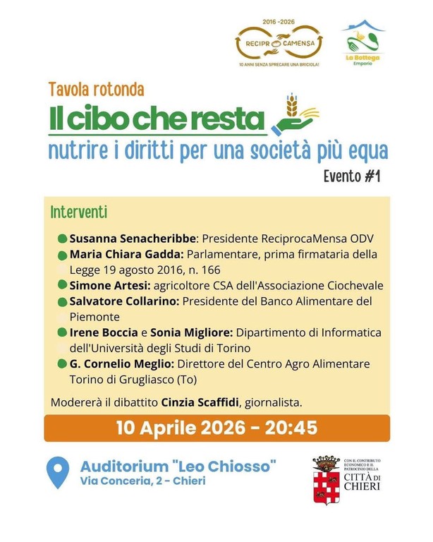Dieci anni di impegno concreto contro lo spreco alimentare e a sostegno delle fasce più fragili del territorio. Un traguardo importante che l’Associazione ReciprocaMensa ODV celebra con un evento pubblico di riflessione e confronto: la tavola rotonda “Il cibo che resta – nutrire i diritti per una società più equa”, in programma giovedì 10 aprile 2026 alle ore 20:45 presso l’Auditorium “Leo Chiosso” di Chieri.
