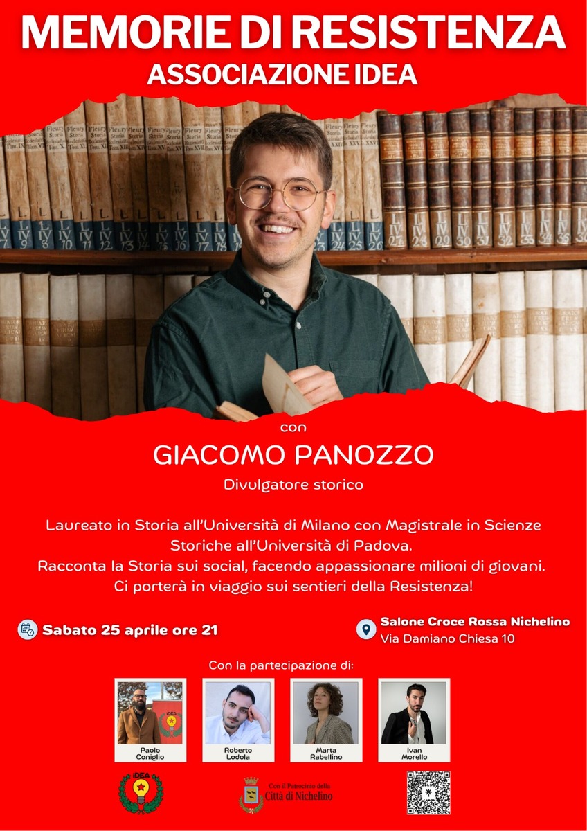 Ospite principale dell’evento sarà Giacomo Panozzo, divulgatore storico laureato in Storia all’Università di Milano, noto per la sua capacità di raccontare il passato attraverso i social media, appassionando milioni di giovani con contenuti accessibili e coinvolgenti. Ad arricchire la serata, gli interventi teatrali di Marta Rabellino, Roberto Lodola e Ivan Morello, che interpreteranno monologhi a tema ispirati alla Resistenza, alternandosi al talk principale e contribuendo a creare un’esperienza immersiva e intensa.