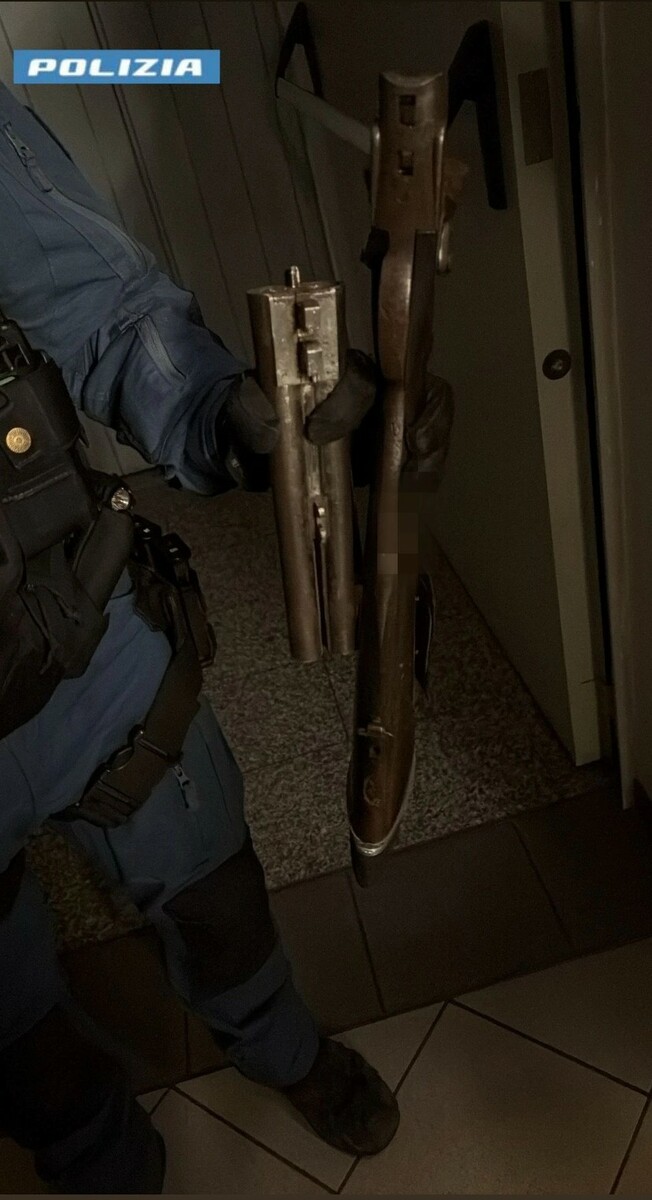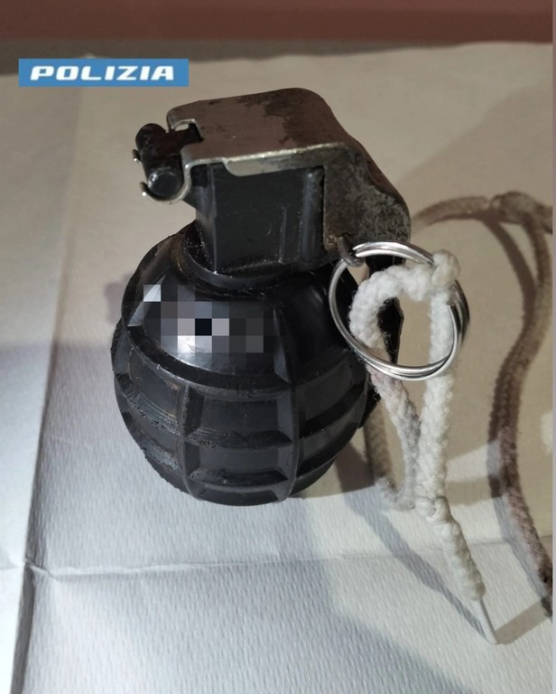 Alla richiesta dei poliziotti, l’uomo non apre la porta costringendoli a forzarla per fare accesso all'interno dell’appartamento. Nel corso della bonifica, nell’armadio della camera da letto, gli agenti trovano un fucile con le canne mozze e un sacchetto contenente diverse munizioni. Sotto il materasso del letto, una bomba a mano modello M 75 perfettamente funzionante con una cordicella collegata alla spoletta pronta all’uso, fatto che richiede l’intervento degli artificieri e dell’unità cinofila antiesplosiva.