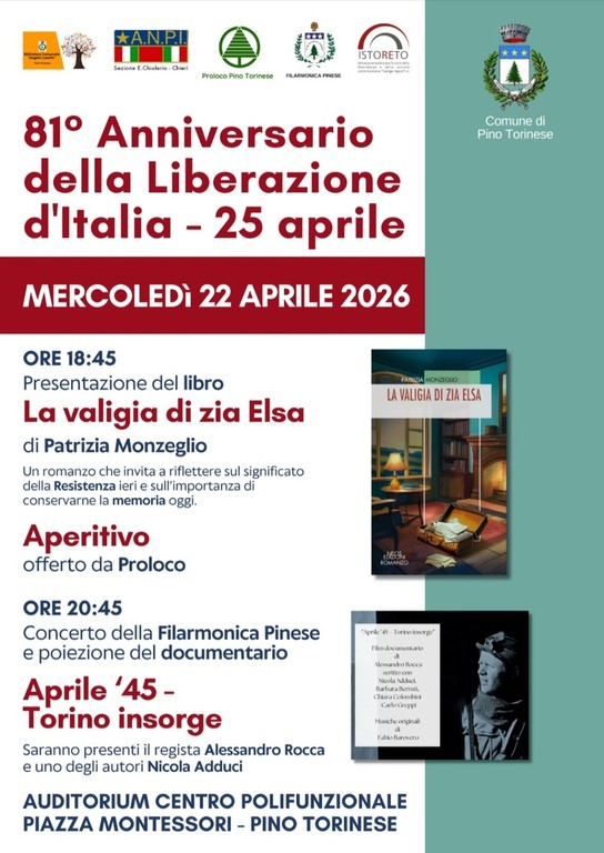 Alle ore 20:45 la serata proseguirà con il concerto della Filarmonica Pinese e la proiezione del documentario "Aprile ‘45 – Torino insorge", un racconto per immagini dedicato ai giorni della Liberazione. Saranno presenti il regista Alessandro Rocca e uno degli autori, Nicola Adduci, l’appuntamento sarà curato dall’Istituto Istoreto (Istituto Piemontese Per La Storia Della Resistenza) per accompagnare il pubblico nella visione e offrire un ulteriore livello di lettura su una fase decisiva della storia del Paese.