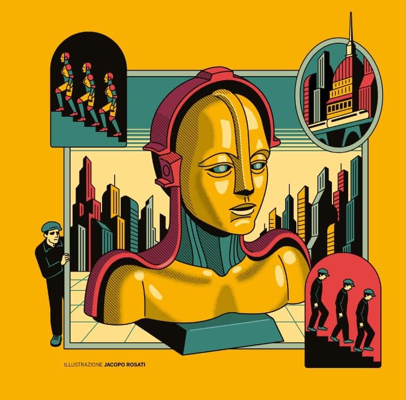 Il manifesto 2026 è firmato dall’illustratore Jacopo Rosati e nasce da una rilettura contemporanea dell’immaginario di Metropolis. La figura robotica centrale prende ispirazione dal Maschinenmensch, l’uomo-macchina del film di Fritz Lang. Da questa suggestione nasce una presenza monumentale inserita in un paesaggio urbano sospeso, in cui tecnologia e umanità si confrontano nella ricerca di un equilibrio tra progresso, memoria e futuro.