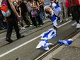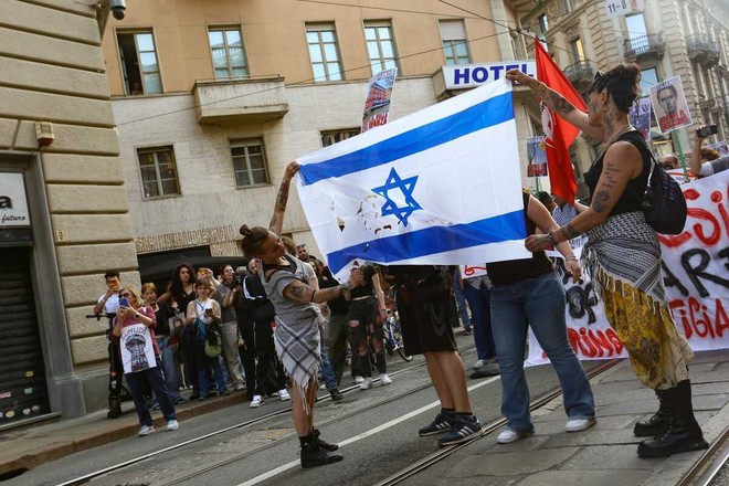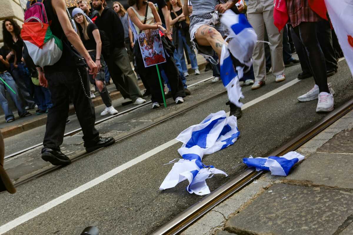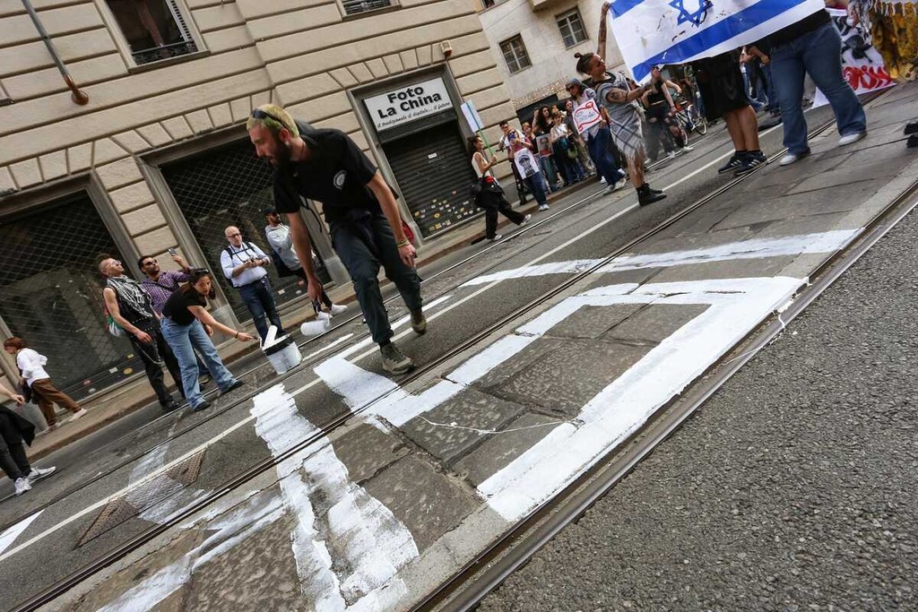 Quando il corteo ha raggiunto via Pietro Micca, intorno alle ore 17,30 sono state strappate due bandiere di Israele. Qualche manifestante con rulli e vernice ha scritto a terra sull'asfalto una grossa frase "Israele Genocida". Bruciate anche alcune bandiere di carta degli Stati Uniti.