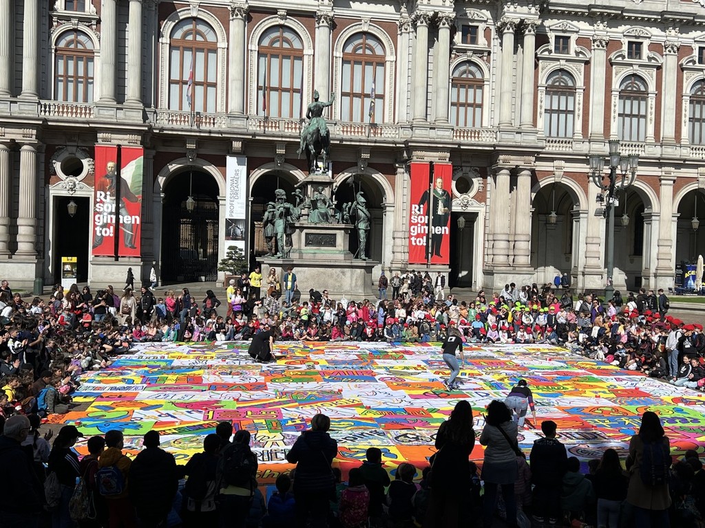 A partire dalle ore 9,30 oltre 200 alunni delle scuole primarie torinesi si raduneranno in Piazza Valdo Fusi per i laboratori che daranno vita a una grande Bandiera della Pace e al Terzo Paradiso.