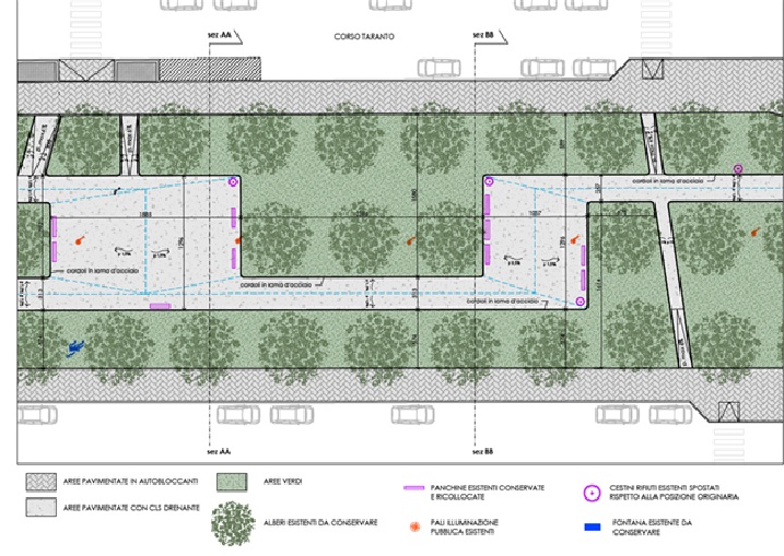 Al posto dell'asfalto verrà messa una pavimentazione drenante, con parcheggi dove potrà crescere l'erba. A queste opere si affiancheranno un nuovo impianto di illuminazione pubblica, la sistemazione delle aree verdi e l’inserimento di elementi di ombreggiamento. Sono inoltre previsti il rifacimento dei marciapiedi lungo via Botticelli e corso Taranto, con materiali drenanti, e la riqualificazione della banchina centrale del corso nel tratto verso piazza Derna, attraverso una nuova pavimentazione e il riordino dell’arredo urbano, che torna ad essere completamente fruibile alla cittadinanza.