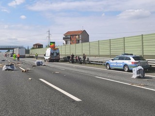 La perdita di carico di un autoarticolato ha provocato un sinistro che ha coinvolto tre veicoli. Due le persone lievemente ferite (codice verde), portate all'ospedale Santa Croce di Moncalieri.