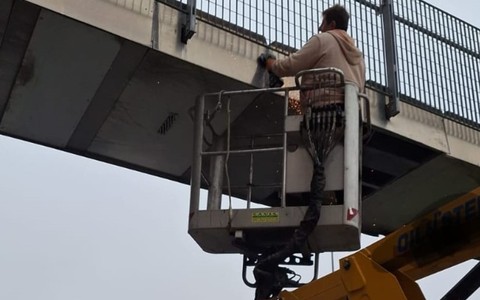 La gru di un grosso autocarro danneggia passerella alla rotonda di Nichelino: traffico in tilt