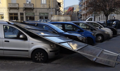 Vento in città, verande e cartelli piombano sulle auto in sosta