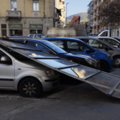 Vento in città, verande e cartelli piombano sulle auto in sosta